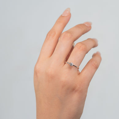 Este anillo solitario en oro blanco se distingue por su diseño ultradelicado y elegante. La banda es fina, pulida y minimalista, lo que hace que el diamante central—un brillante redondo sostenido por una montura clásica de cuatro garras—sea el protagonista absoluto. La delgadez del aro aporta una estética ligera y femenina, ideal para quienes buscan un estilo sutil pero lleno de brillo. El oro blanco refleja la luz con suavidad y realza los destellos de la piedra, creando una pieza atemporal, moderna y perfecta para el uso diario o como un anillo de compromiso minimalista y sofisticado.