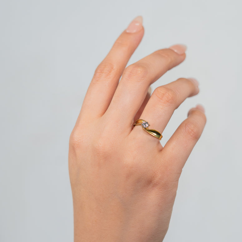 Es una pieza de oro amarillo diseñada para destacar por su movimiento y delicadeza. Su banda fluye en un elegante giro asimétrico adornado con un fino borde milgrain que aporta textura y un toque vintage. En el centro, un diamante redondo de brillo intenso se sostiene mediante una montura clásica de cuatro garras, elevando la luz y generando destellos desde cada ángulo. La forma ondulada del aro crea un efecto envolvente que enmarca suavemente la piedra, logrando una estética romántica, femenina y atemporal. Un anillo perfecto para quienes buscan una joya con carácter, sutileza y un diseño poco común.