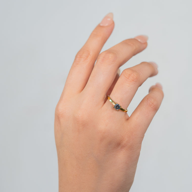 El Anillo Eliza es una pieza minimalista y elegante diseñada para quienes buscan delicadeza con un toque distintivo. Está elaborado en oro amarillo pulido y luce una banda fina y uniforme que estiliza la mano sin robar protagonismo a la piedra central. Su gema redonda, de tono gris-azulado, aporta un brillo único y especial; y está sostenida por una montura clásica de seis garras que eleva la piedra con sutileza, permitiendo que la luz resalte cada faceta. Es un anillo atemporal, delicado y sofisticado, perfecto para quienes aman la simplicidad con un destello de carácter.
