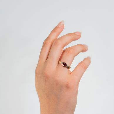 Es un anillo de oro amarillo que celebra el romanticismo con un diseño dulce y atemporal. En el centro destaca una gema en forma de corazón, de un profundo tono rubí rojizo que capta la luz con intensidad y calidez. Esta piedra central está engastada en un bisel suave y elegante que realza su silueta y protege su contorno.