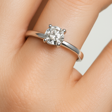 Alexandra es un solitario clásico en oro blanco pulido con un diamante central redondo engastado en cuatro garras altas que dejan pasar la luz desde todos los ángulos. La banda ligeramente más sólida le da presencia sin perder delicadeza, creando una pieza atemporal, elegante y sofisticada, perfecta como anillo de compromiso o como joya principal para usar todos los días con estilo de realeza.